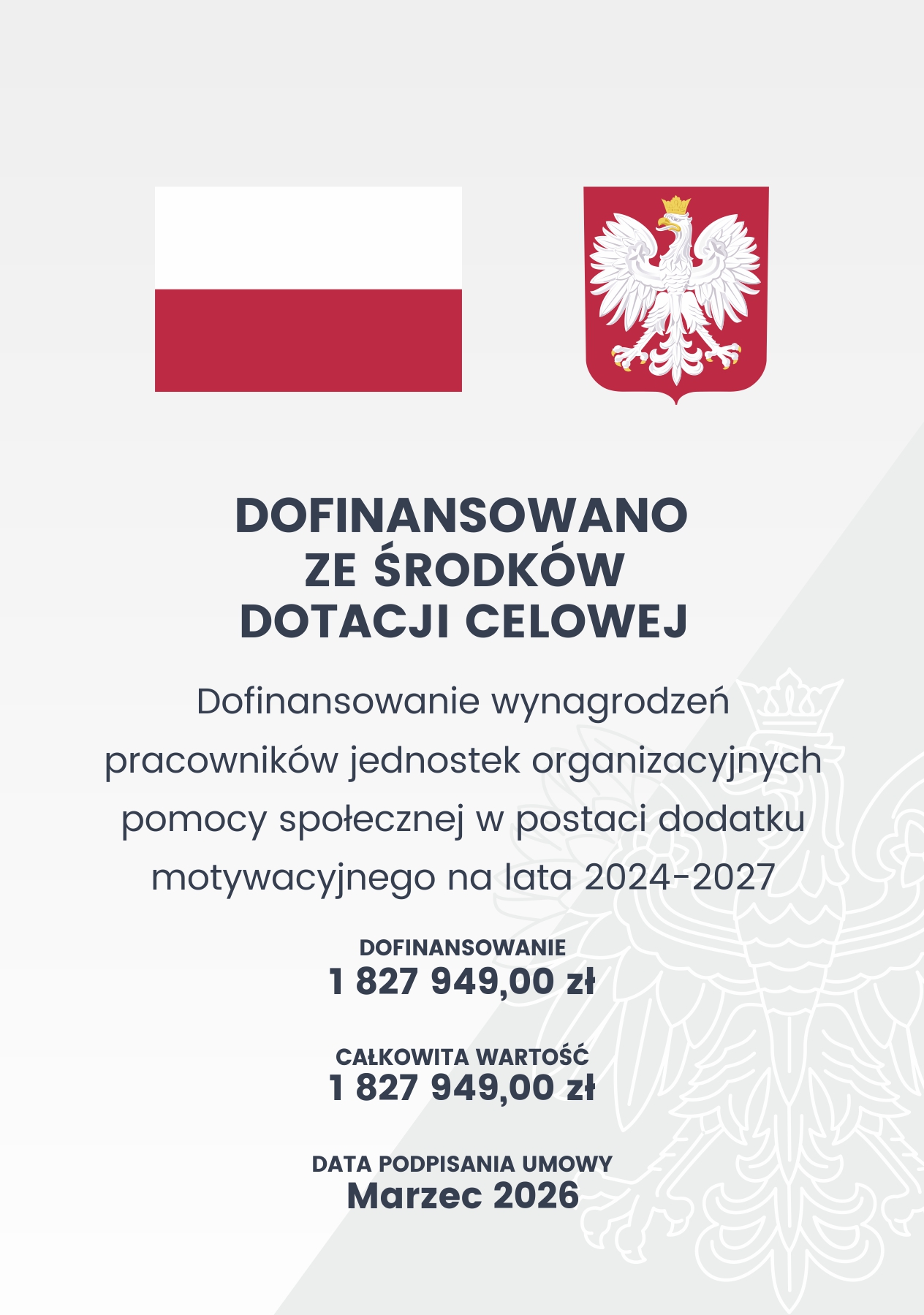 Powiat Bialski otrzymał dotację celową z budżetu państwa na realizację zdań własnych wynikających z rządowego programu „Dofinansowanie wynagrodzeń pracowników jednostek organizacyjnych pomocy społecznej i osób prowadzących rodzinną pieczę zastępczą w postaci dodatku motywacyjnego na lata 2024-2027